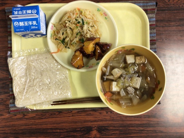 今日の献立は「牛乳、きのこうどん、大学いも、ニラのあえもの」でした。大学いもは、1・2年生が畑で収穫したサツマイモを給食で使用しました。美味しいサツマイモでした。1・2年生の皆さん、ありがとうございました。