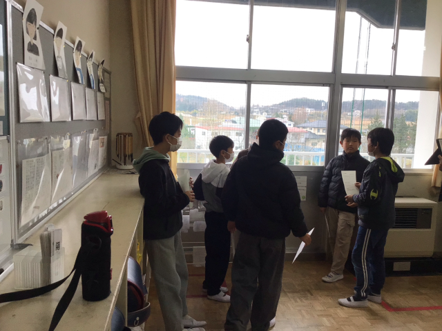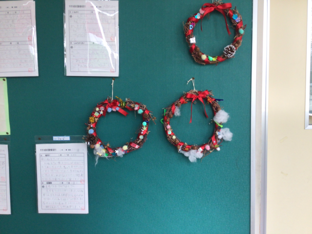 1・2年教室の廊下にはクリスマスリースが掲示してあります。12月になり、2学期の終わりが近づいてきました・・・。