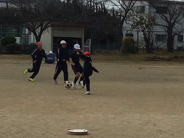 3・4年生はサッカーの授業です。ボールを一生懸命追いかけていました。強いパスだと味方がうまく取れません。強いボールをければいいというわけではないのが難しいところです。