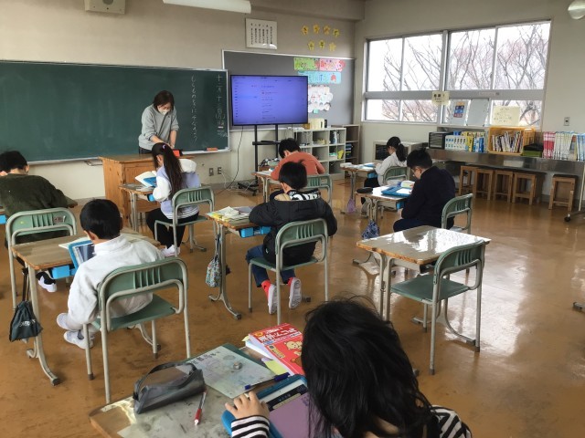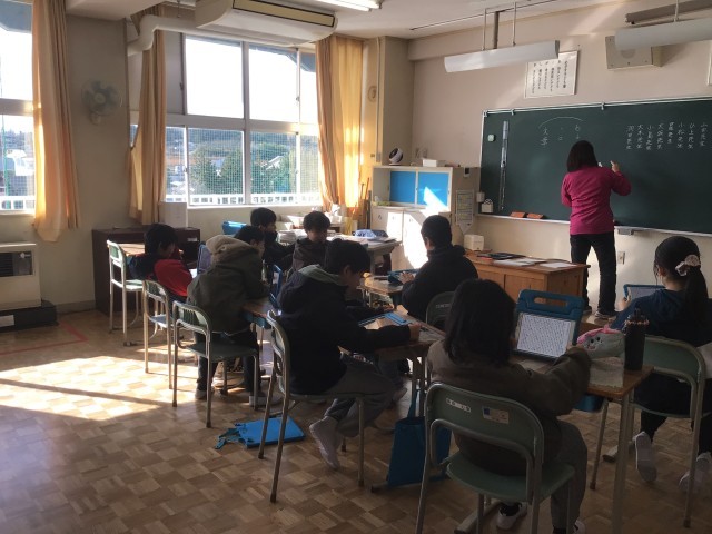 3年生は音楽の授業でした。高音と低音に分かれて部分合唱をしていました。つられると言いながらも、お互いの声を聞き合って歌っていました。4年生は国語の学習でした。フィッシュボーンというタブレットのツールを使って作文のメモを作り、メモをふくらませて作文を書いていました。タブレットを使い先生にデータを提出することで、進み具合も容易に把握できますし、お互いに読み合うことも簡単にできます。6年生は卒業文集を作っていました。お互いの作文を読み合い校正していました。卒業に向けての準備が少しずつ進んでいます。