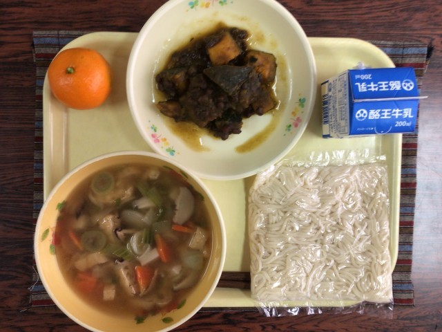 今日の献立は「牛乳、きつねうどん、冬至カボチャ、みかん」でした。今年の冬至は12月21日です。カロテンやビタミンCが豊富な栄養価の高いカボチャを食べて元気に冬休みを迎えたいですね。