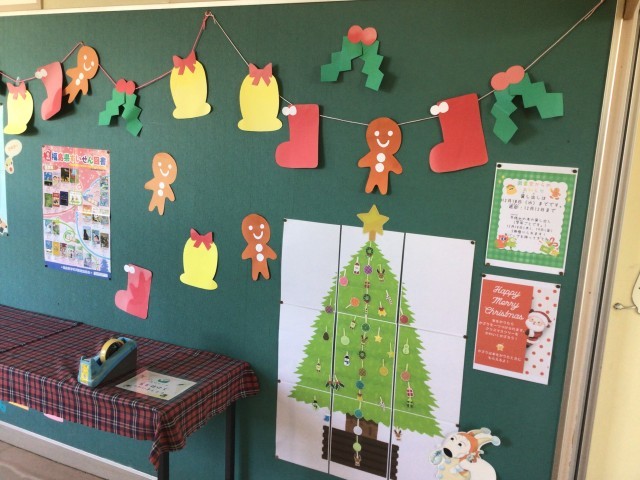 図書室前の掲示板はクリスマスバージョンになっています。本を借りるとツリーの飾りをつけられるというものです。18、19日が冬休みの本の貸出日です。