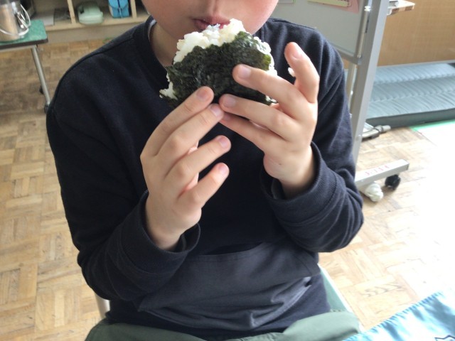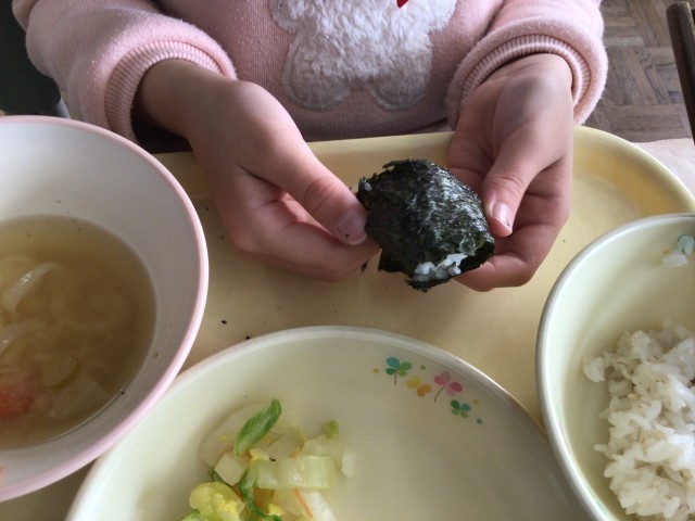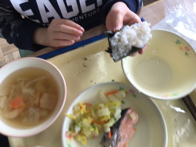 1月24日から30日は学校給食週間です。今日の献立は「麦ごはん、牛乳、手巻きのり、焼魚(しゃけ)、浅漬け、ねぎのみそ汁」でした。ビニール袋に麦ご飯を入れて形を整えてセルフおにぎりにして食べました。教室を回ると低学年も上手におにぎりにして食べていました。明治22年に、山形県の小学校でお弁当を持ってこられない児童のために「おにぎり、塩ざけ、つけもの」の給食を準備したのが、日本の学校給食の始まりです。