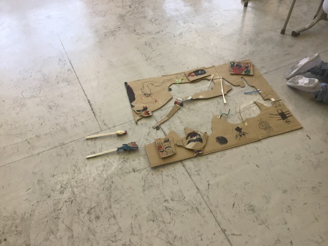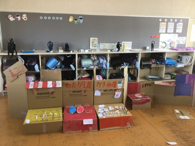 4年生の図工は「ようこそゆめの町へ」という題材でした。ダンボールを組み合わせて子供たちなりのゆめのまちをつくっていました。「焼きそばとお茶を売ってます」「ここは食堂です」など、とても楽しそうに活動していました。焼きそばを注文したら、鉄板で焼いて作ってくれました。