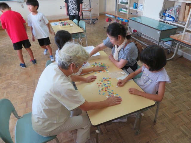 14名の方にご来校いただきました。中には、遠くから孫のためにおいでくださった方もいらっしゃいました。暑い中、たくさんの方にご来校いただき感謝申しあげます。けん玉、お手玉、こま回し、おはじき、羽子板、福笑い、折紙などの遊びに子どもたちは挑戦しました。コツを教えてもらうと「できた!」と笑顔いっぱいの子どもたち。こま回しは、1年生の子が一番上手で、大人が教えてもらう一幕もありました。子どもたちも大人も笑顔いっぱいの楽しい時間となりました。ありがとうございました。