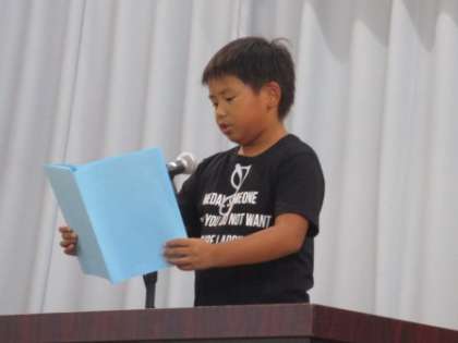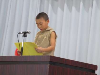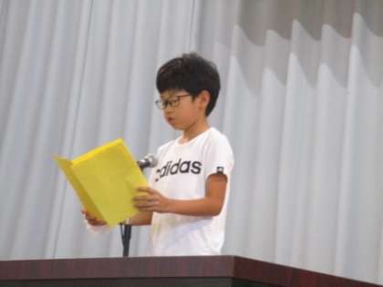 祖父母の皆さんに感謝を込めて4年代表 やなぎ田君、5年代表 片岡君、 6年代表 添田君が作文を発表しました。おじいちゃん、おばあちゃんへの健康の気遣いや日ごろの感謝の気持ちがつたわり、心の成長を感じました。