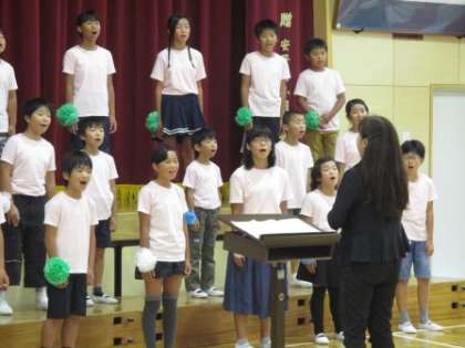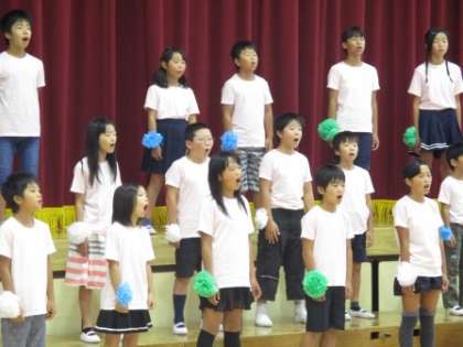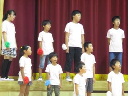 敬老会アトラクション部門のオープニングを飾って、安子島小特設合唱部の演奏を聴いていただきました。曲は、市合唱祭で披露した「ふるさと」です。