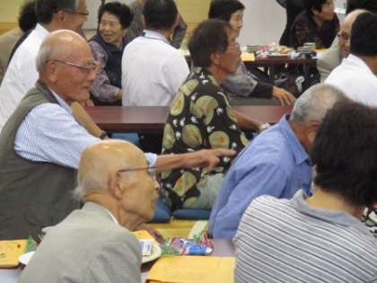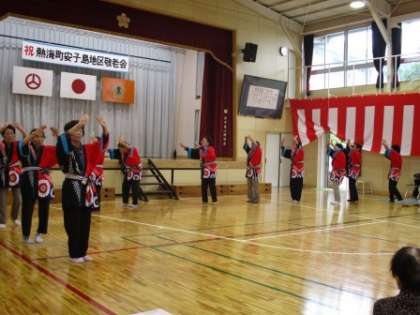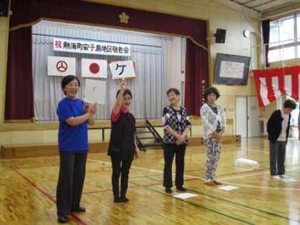 100歳体操の方々が、会場のおばあちゃんおじいちゃんに脳活性化の認知予防体操を行いました。そして背中に文字を書く伝言ゲームで、安子島地区の高齢者の皆さんの脳トレを行いました。みんな楽しくいきいきと活動していました。また、転倒防止会のみなさんによる郡山市民の歌の踊りを披露していただきました。