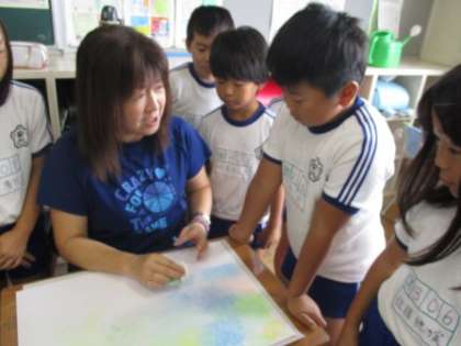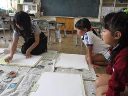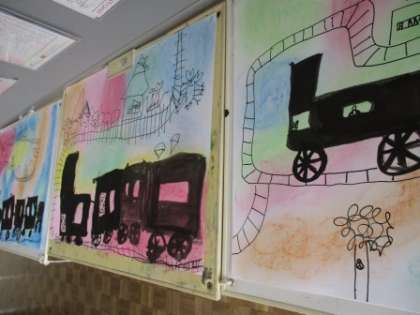 講師の石井先生においでいただき、絵画教室を行いました。1年生は「機関車」を、2・3年生は「空想の世界」を題材に描きました。コンテの使い方を教えていただきながら、機関車をそれぞれが走らせたり、思い思いに空想の世界を描いていました。