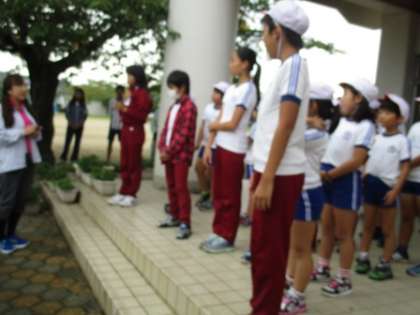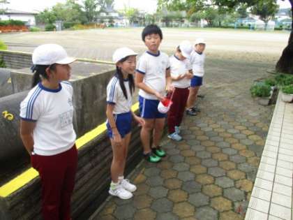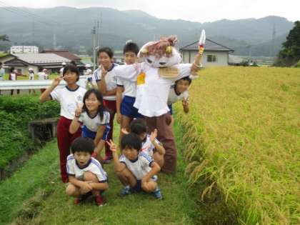 すくすく水田に5人の案山子を立ててきた児童の皆さん。代表で5年生が感想を発表しました。班員で力を合わせて作ったかかしが、とても頼もしく見えたそうです。10月17日の稲刈りが楽しみです。