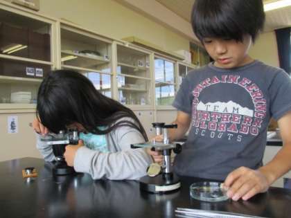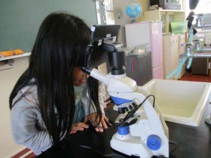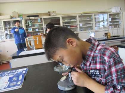 植物のせい長の様子を顕微鏡で見た5年生。教頭先生のアドバイスを受けながら、顕微鏡の使い方を学びました。植物の生きている様子を目の当たりにして驚きの声を上げていました。