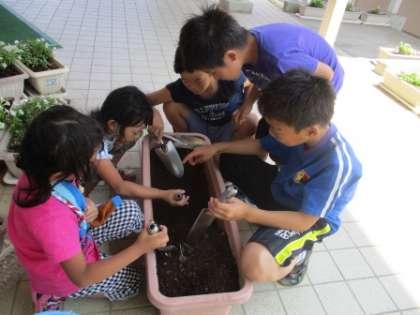 夏休みに入るとすぐ、地域の方からいただいたカブトムシの幼虫が次々に成虫になっています。5年生と2年生が中心になって昆虫部を結成し、土の中から表れたカブトムシを虫かごに入れています。すでに6匹に名前をつけ、昆虫部員の愛情によって育てられています。昆虫部員の野望としては、今後このカブトムシたちから子孫を育てたいそうです。