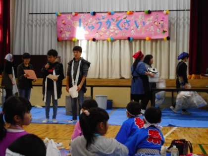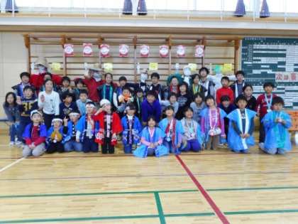 案山子コンテストの投票結果が6年生から発表されました。今回は、「安子島米米クラブ賞」「安子島老人会長賞」「安子島婦人会長賞」「PTA会長賞」「JA福島さくら安子島支部長賞」「あこっぴー賞」がそれぞれの班に贈られました。その案山子さんたちの前で記念に写真を撮りました。