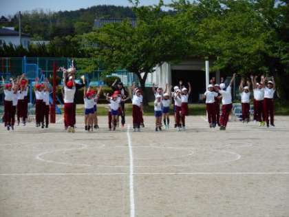 晴天のもと、運動会の予行練習をしました。プログラムのうちの8種目だけでしたが、気合いを入れてがんばりました。運動会では「輝く未来に向かって」全力を尽くしてがんばろうと、全校生「希望のジャンプ」をしました。