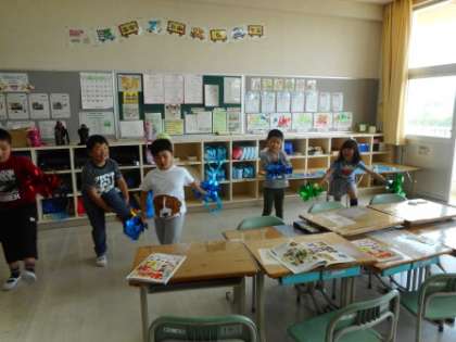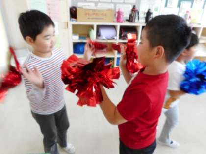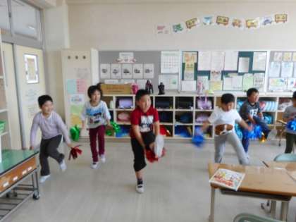 毎日おどっている2年生ですが、あこがれのグッズを手に持ち、やる気も十分に全校ダンスの練習です。名実ともに「あこがれのダンス」を披露したいと思います。