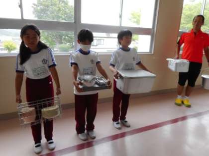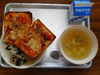 今日の給食は、ピザトースト。一枚一枚愛情込めて焼き上げられたトーストに児童のみなさん大満足。午後からの運動会練習にもエネルギーが出ました。今日も給食は残滓ゼロ。「おいしい給食、ごちそうさまでした。」