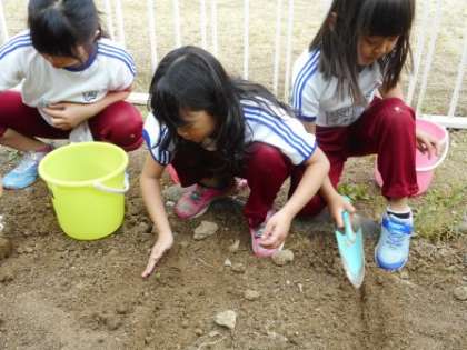 さっそく双葉になったひまわりを、花壇に植えた3年生。ひまわりが大きく育った姿をイメージして間隔をとって植えました。