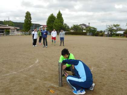 運動会の花火の時間にあわせたかのように、雨がやみ青空が見えてきました。PTAの役員の皆さんが見守る中、教頭先生が運動会実施の花火を打ち上げました。