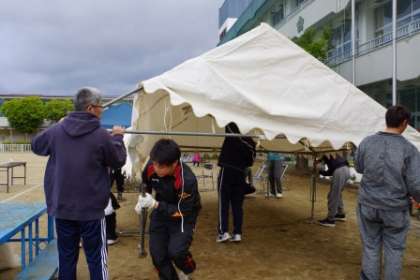 早朝からPTAの皆さんに集まっていただき、会場を設営していただきました。強風対策をし、安全に実施できるよう万全にしていただきました。PTA会長さんの割り振りで分担がよくされており、あっという間にできあがりました。
