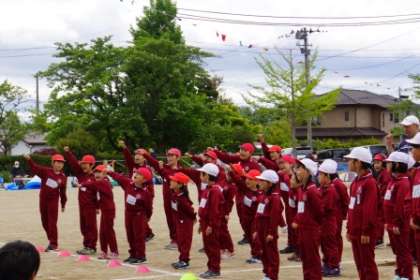 最初に鬨の声をあげたのは、昨年優勝した紅組。校庭に「ファイャー!」の声が響き渡りました。