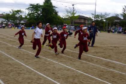 上級生の全力徒競走を見て、自分たちも最後まで力いっぱい走ろうと1年生が最後までがんばりました。5年後がたのしみな1年生の走りでした。