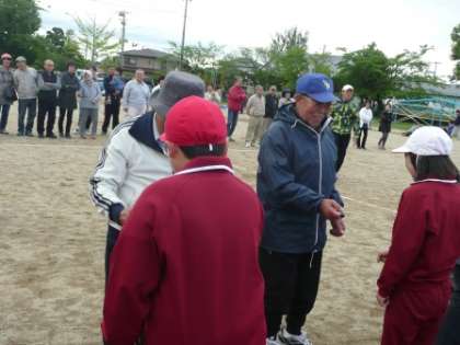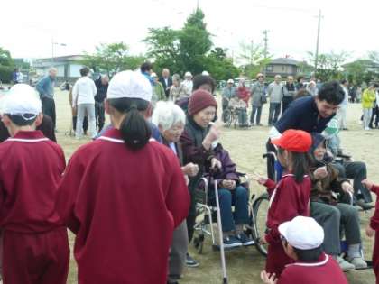 敬老の皆さんが「お宝」を拾う前の関門として、児童とのジャンケンが今回用意されました。何度ジャンケンをしても負けてしまうお年寄りにやさしく負けてやる児童も。とても楽しい交流となりました。