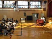 太鼓を叩く早津君、添田さん、片岡君。リズムを正確に刻みとっても踊りやすかったと好評でした。
