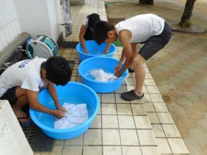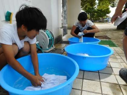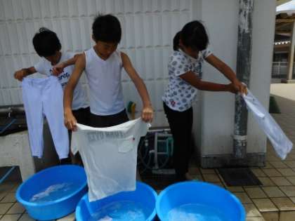 自分の汚れ物を手洗いで洗濯した6年生。洗濯機がやってくれたことを自分の手できれいにしました。特に汚れがひどい靴下やソフトボールで汚したズボン、Tシャツをゴシゴシ丁寧に洗いました。自分でも驚くほど真っ白になり、満足した6年生。けれど、やっぱり「洗濯機は楽だわ」との感想。お家の人たちにも感謝した6年生でした。