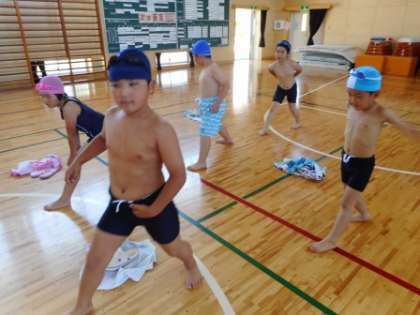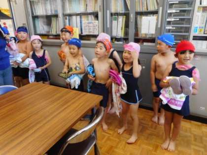 1・2年生は、プールに入るためのオリエンテーションを行いました。着替えの仕方、脱いだものの始末、トイレ、準備運動の場所としかた、プールへの道順など一つ一つ確認しました。初めてのプールということで着替えたあと、職員室であいさつをしてプールに向かった1・2年生。とても楽しみにしています。