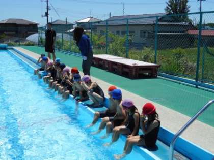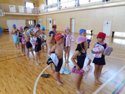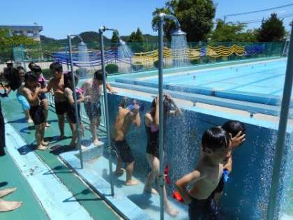 1・2年生は、体育館で準備運動を終え、いざプールへ移動。シャワーの使い方を学び、プールサイドへ。