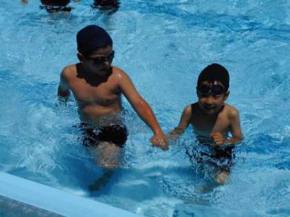 2年生が先にプールの中に入り、1年生がプールの中に入るのを手伝いました。こわがる1年生もいましたが、2年生が言葉をかけながらゆっくり手を差し伸べて全員入ることができました。2年生は、1年生と手をつないでプールサイドからプールサイドまでエスコートして歩いて移動です。