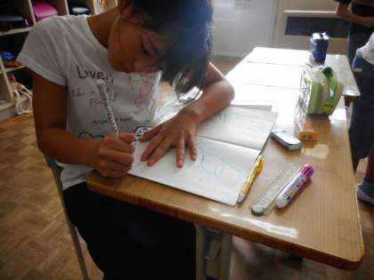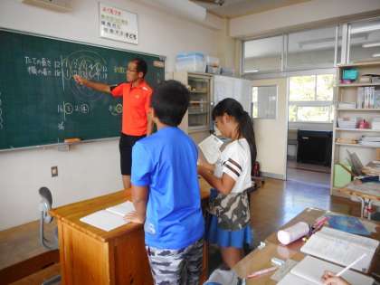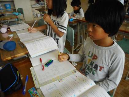 文章題になると,倍数と約数がわからなくなる苦手意識をのりこえるために、コツを学習した5年生。約数と公約数、公倍数を利用した練習問題にねばり強く取り組んでいます。