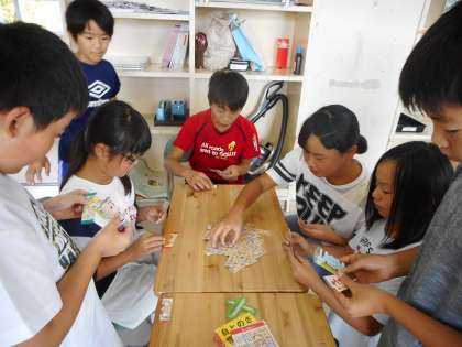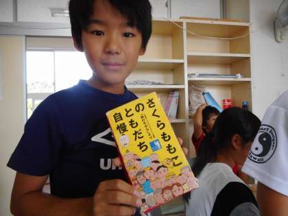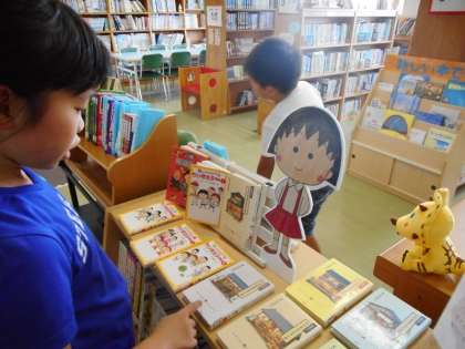 外はまだ気温が高く、休み時間は、室内で過ごす日が続いています。図書室で特集している「ちびまるこちゃん」の遊びが人気です。