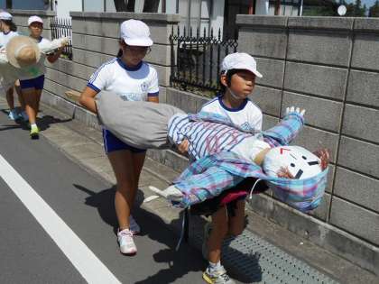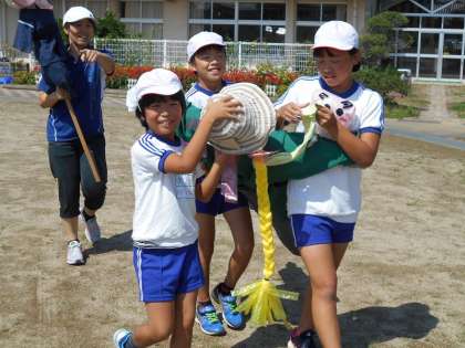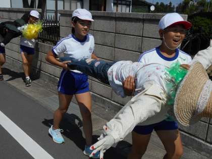 先日、縦割り班でつくった案山子たちをすくすく水田に運びました。金色に実ってきたすくすく水田を守ってもらう案山子たちを大事に5・6年生が抱えて移動です。