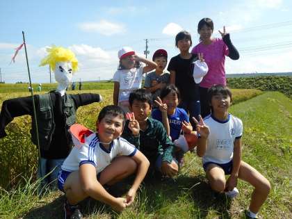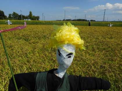 すくすく水田の稲穂を守るのは、元気いっぱいの少年たち。その中でも特に威勢のいい少年をイメージしてつくった案山子の「全米少年」。顔の表情とインパクトのある髪形で、鳥たちを追いはらってくれるはず。頼むぞ、全米少年!
