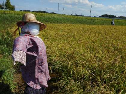 お米のことにかけて熟練の仕事をする「おふくろ」さん。にらみをきかした表情、そしておしゃれな農作業姿で登場した「おふくろ」さん。すくすく水田をたのんます、おふくろ!
