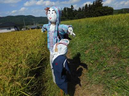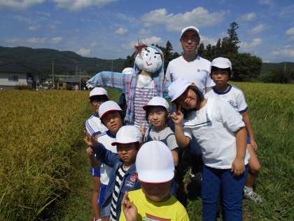 お米を守るために、一生懸命案山子づくりに力をつくした班員のコウタ君。彼の名前の一字をとって「マイ太」と名付けられた案山子。子供の「コメ太」君もいます。親子でまちがいなく、一生懸命、鳥たちからお米を守ってくれると思います。