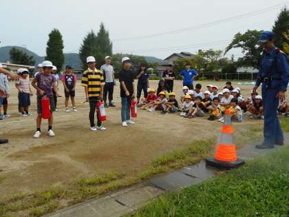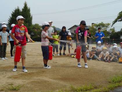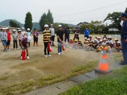 署員の方に見習って、6年生が消火器を使って火を消す訓練をしました。合い言葉は、「ピノキオ」です。