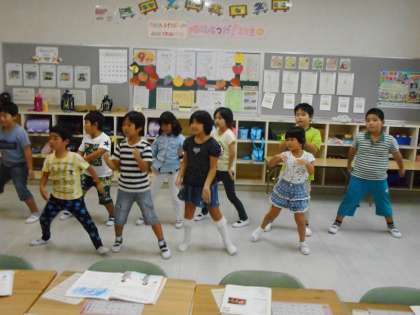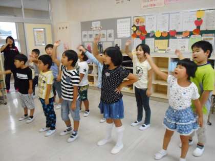 手話を交えて今月の歌「世界に一つだけの花」の練習をする1・2年生。歌詞の気持ちをこめ、身体を使って表現。とても上達しました。