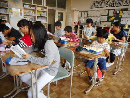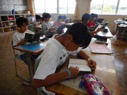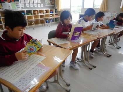 朝の読書タイム。本のおもしろさに引かれて、集中して読んでいました。