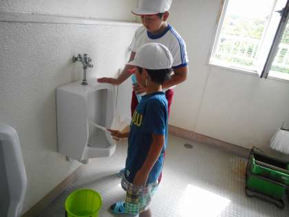 上級生が行っているトイレ清掃を1年生が手伝っています。上級生もていねいにトイレ清掃のやり方を教えて、うまくできるように時間をかけて教えていました。トイレの清掃が行き届いている学校は、気持ちよく生活できます。
