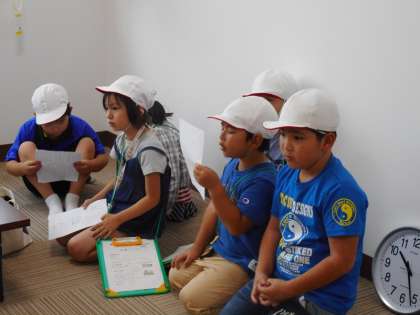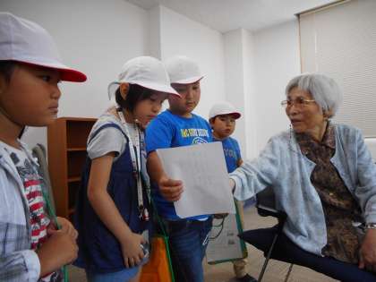 「ほっとあたみ」を利用していた詩吟グループのみなさんのところにおじゃましました。「もみじ」の歌をうたい、その後の詩吟をいっしょに吟じました。おばあちゃん達の朗々とした声にびっくりした2年生。いろいろな活動、たくさんの市民の方に施設が使われていることを知りました。