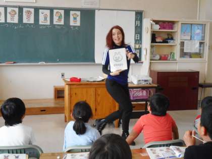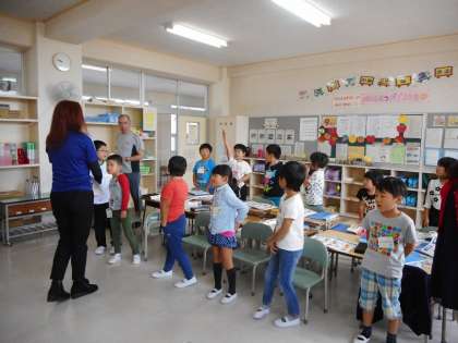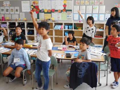 「今日の気分はどんなですか?」。何とおりもの答えを練習した1・2年生。繰り返し練習し、ジリアン先生のジェスチャーを交えた気分に英語で元気に答えました。ペアでも練習し、上手にあいさつできるようになりました。