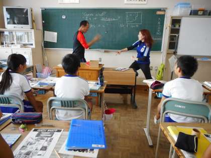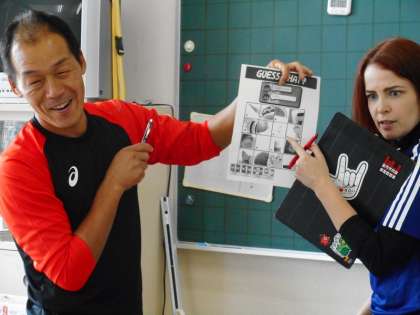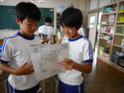 5・6年生に不思議な写真を見せるジリアン先生。この写真はの正体は?全員でなぞの写真の正体を英語で答えた5・6年生。ジリアン先生と町田先生のやりとりに自信を得て、自分たちで絵をかいて「Guess What!」。英語で会話ゲームをしました。その後、英単語を書き取り、発音のちがいも確認して、とても楽しく英語の授業をすることができました。