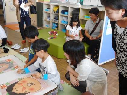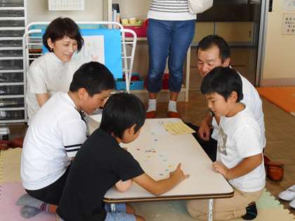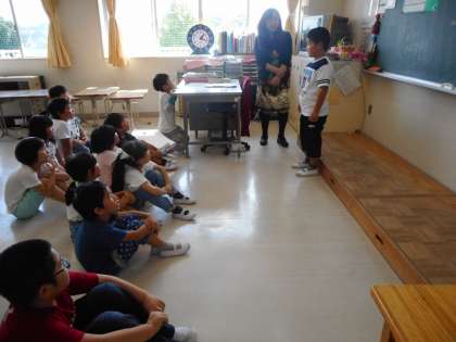 1・2年生は、祖父母参観においでいただいたおうちの方々と「昔遊び」を楽しみました。おじいちゃんおばあちゃんにやって見せてもらって歓声があがっていました。