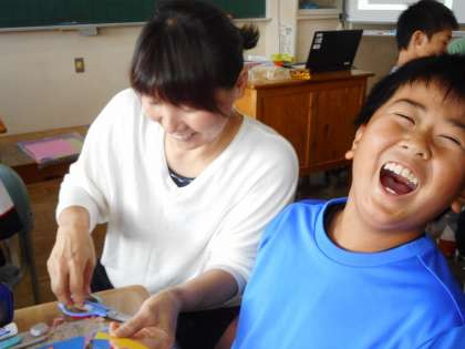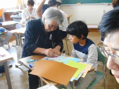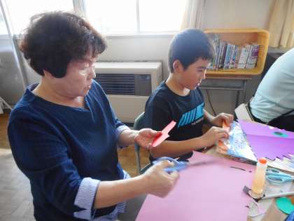 楽しませるおもちゃに必要なものは、笑い。顔の表情やくちびるの形など工夫していました。おじいちゃんやおばあちゃんの方が真剣になって・・・自分でつくって自分が一番楽しんでいる5年生もいました。