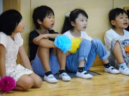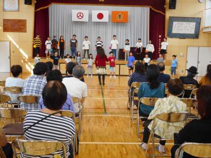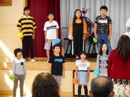 おじいちゃんおばあちゃん方に心をこめて歌をプレゼントしました。まずは、3〜6年生による「かけがえのないこと」。気持ちが伝わるように一つ一つの言葉に心をのせて歌いました。体育館のそでで聴いていた1年生が、上級生の歌にあわせて一緒に口ずさんでいました。感謝の気持ちは一緒です。