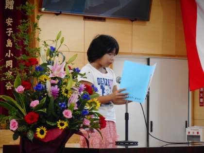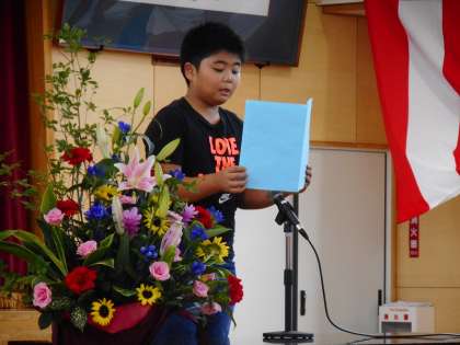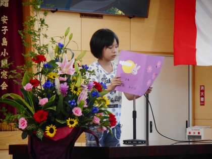 児童代表の4名が日頃から愛情を注いでくれているおじいちゃん、おばあちゃんへの感謝の作文を発表しました。心のこもったあたたかい発表でした。