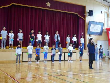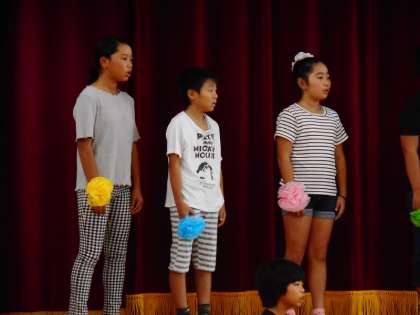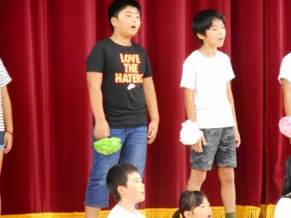 敬老会第2部のアトラクション最初のプログラムは、安子島小児童による合唱。心をこめて「かけがえのないこと」を3〜6年生で歌いました。