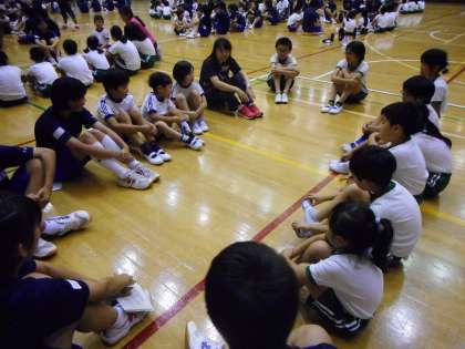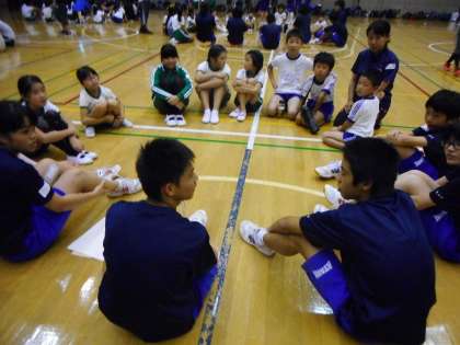 熱海地区の小中学校3校がユラックス熱海に集まり、学校保健活性化モデル事業の体力向上プログラムに参加しました。まずは、17グループに分かれて、熱海中学校のお兄さんお姉さん、熱海小学校のみなさん、安子島小学校で自己紹介を行いました。